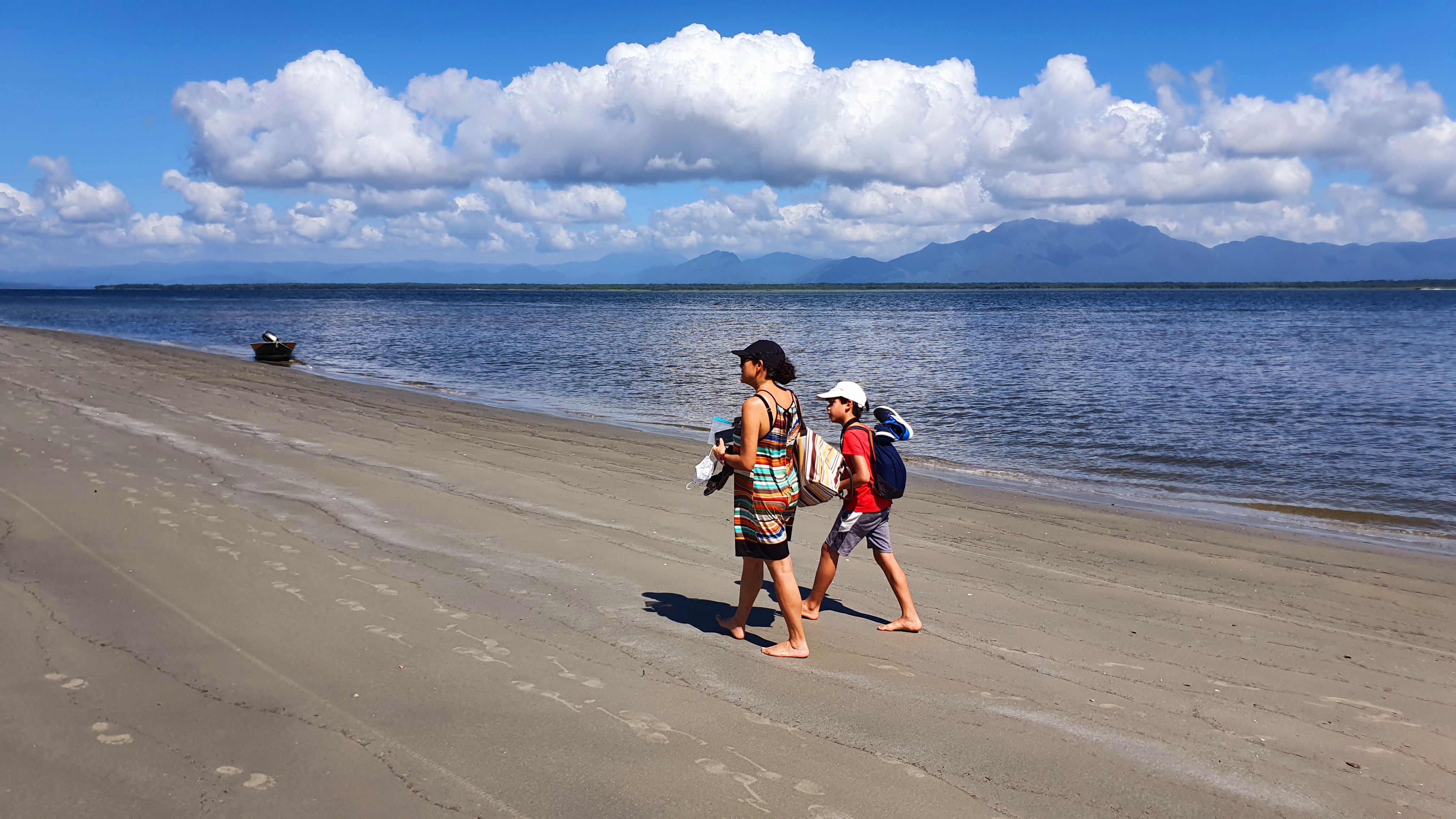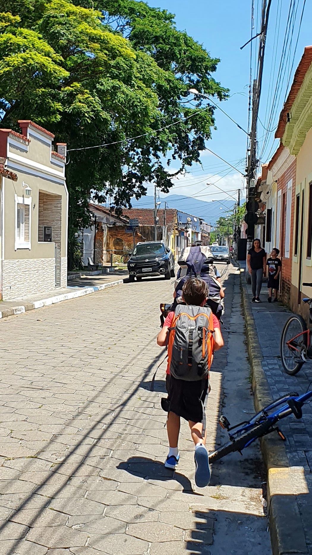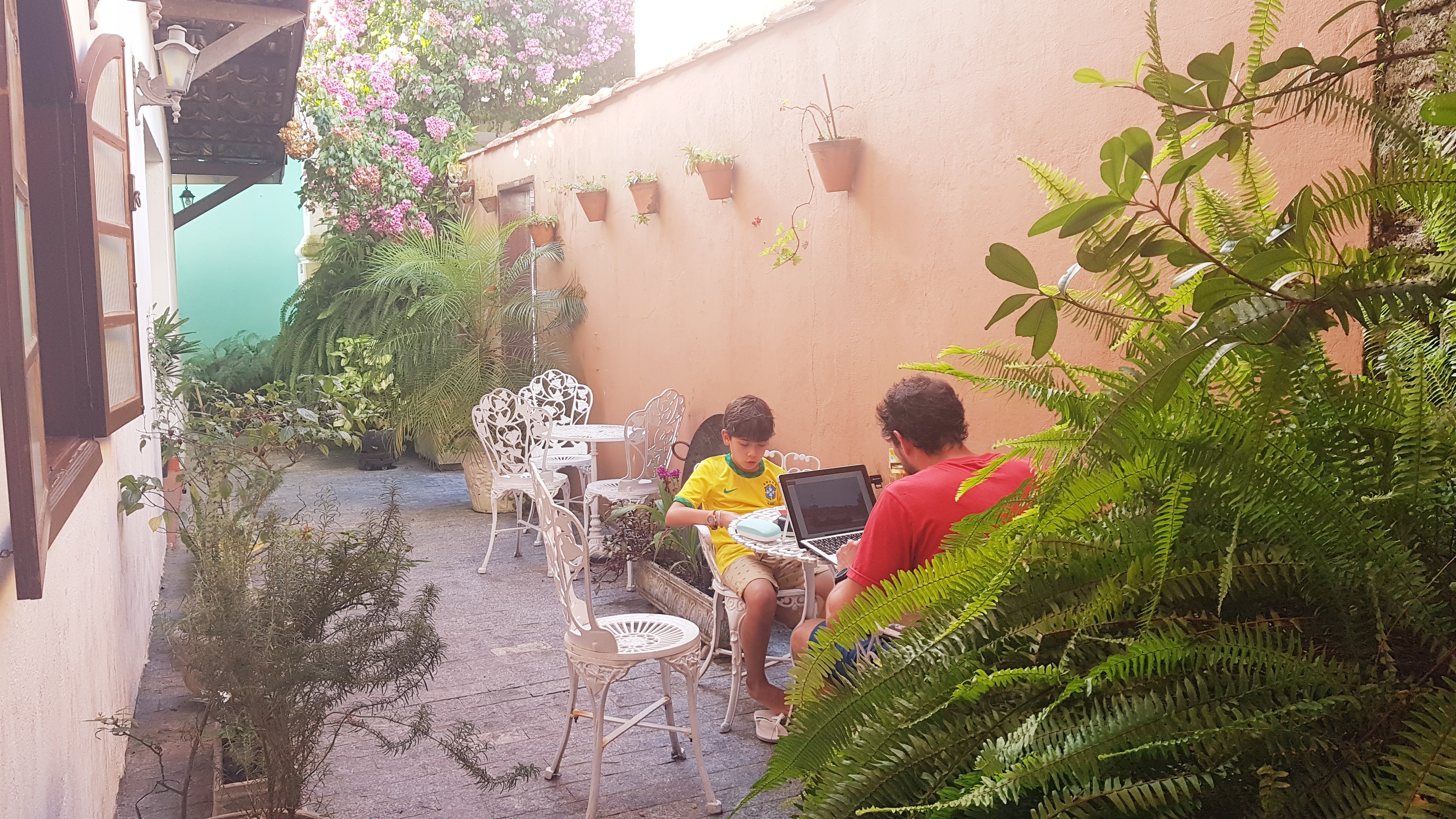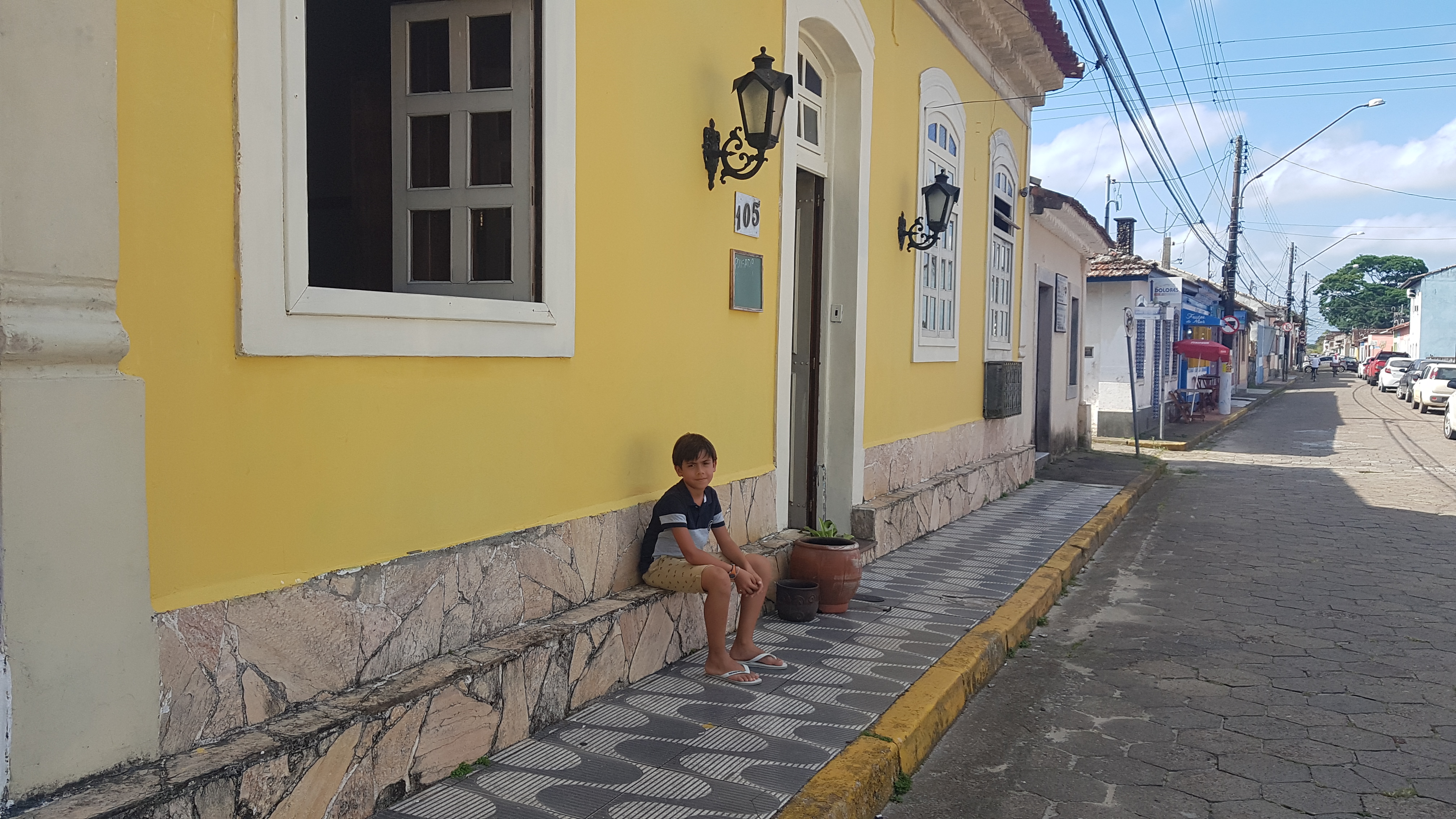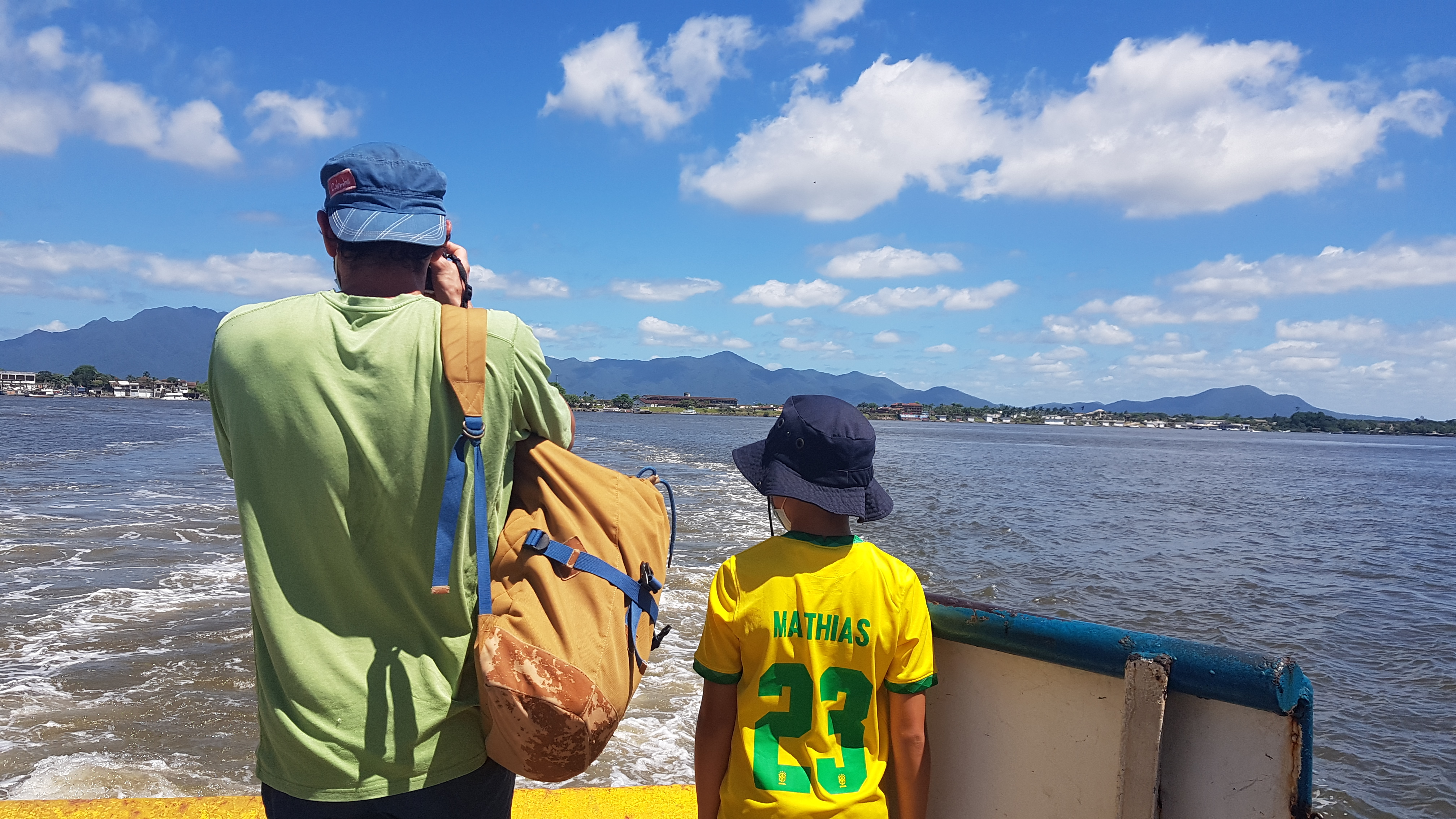 Quoi de mieux pour bien se mettre dans le bain que de faire 3h15 de bus (certes climatisé) au départ de São Paulo vers Registro, puis enchaîner avec un autre bus autrement plus rustique en direction de la ville de Cananeia. Après un total de 5h de trajet, l’arrivée sur une grande place totalement dépourvue d’arbres aux abords de la ville, sous une chaleur accablante, nous a un peu prise de court. Notamment au moment d’essayer de s’orienter sans autre information que le nom de la pousada où nous étions attendus. Heureusement pour nous, il n’a finalement pas fallu beaucoup marcher pour trouver notre nouveau QG pour les 4 prochaines nuits.