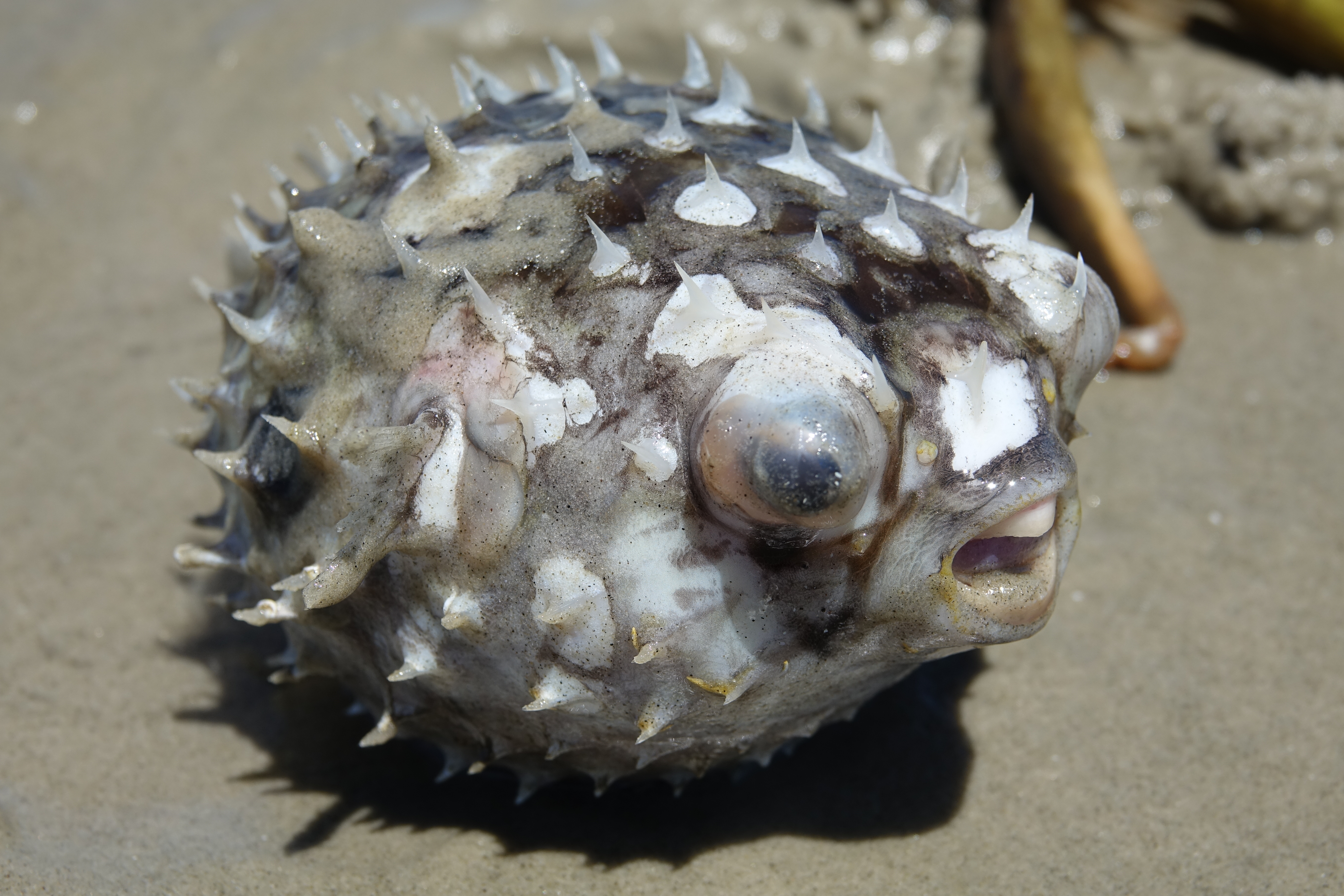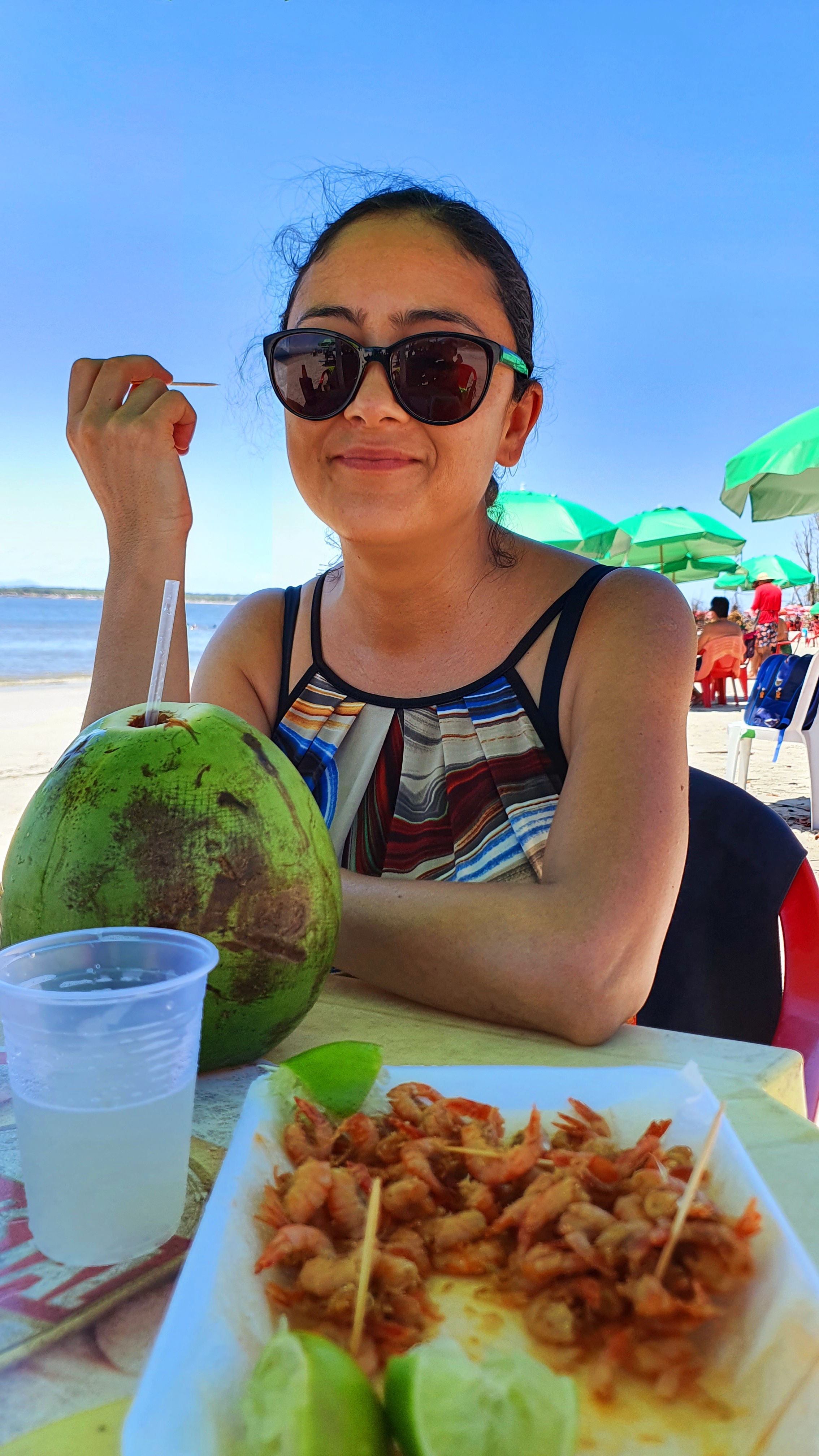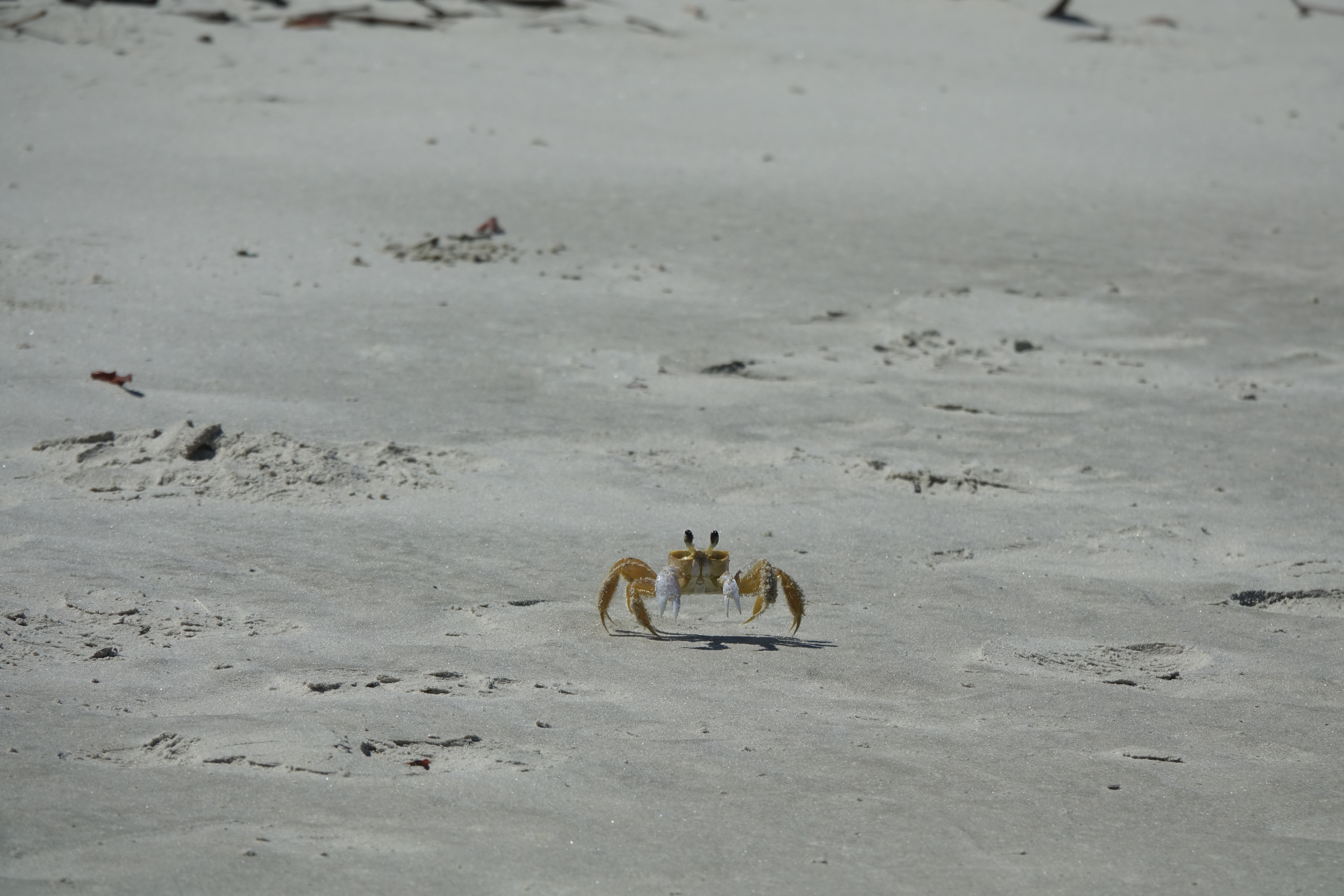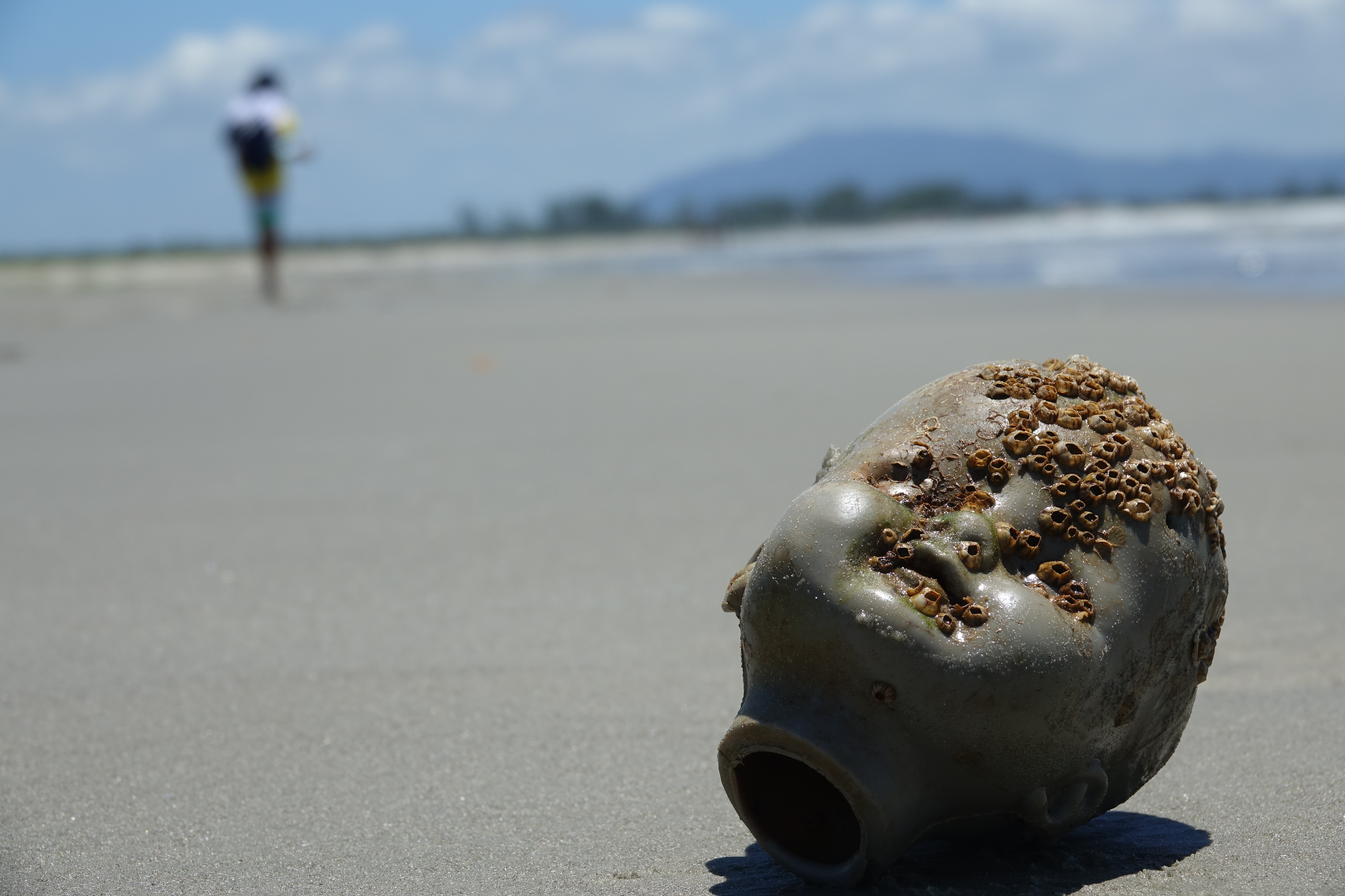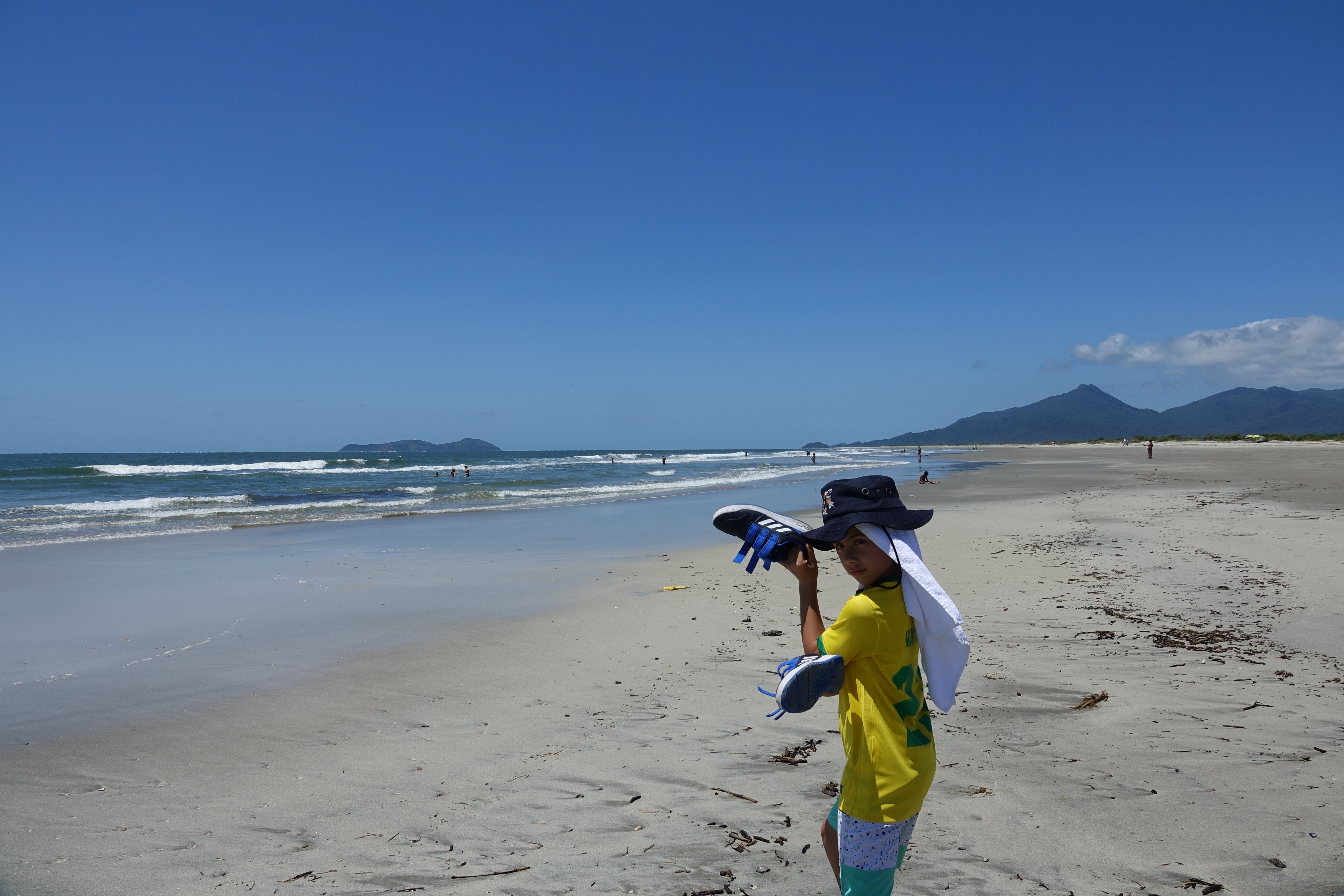 En face de Cananéia se trouve donc la grande soeur, Ilha Comprida. On s’y rend en Bac, environ 20min et gratuit pour les piétons et cyclistes. Quand à Cananéia nous avons demandé quel moyens de locomotion nous pouvions espérer trouver de l’autre coté, personne n’a su nous répondre, sinon qu’il y avait au pire 3/4km de marche pour arriver sur les plages océanes. Nous étions un peu déroutés par ce manque d’informations, et pas hyper motivés à l’idée de marcher en plein soleil, au bord d’une route poussiéreuse, fréquentée par des fous du volant et quelques alcoolisés. Heureusement pour nous il n’en était rien, et nous avons tout simplement pris un bus de liaison entre le débarcadère coté ouest, et les plages à l’est. Une fois sur place, la plage n’est pas des plus engageantes: disons plutôt qu’elle est belle au premier abord, mais l’eau envahie de déchets, et les touristes peu respectueux du lieu ne nous laissent pas de doute: ça ne sera pas la plage de nos rêves… Nous trouverons malgré tout de quoi alimenter notre imaginaire en marchant le long du littoral. Nous en ramènerons de beaux clichés, quelques squelettes d’étoile de mer, et pour ma part de beaux coups de soleil…