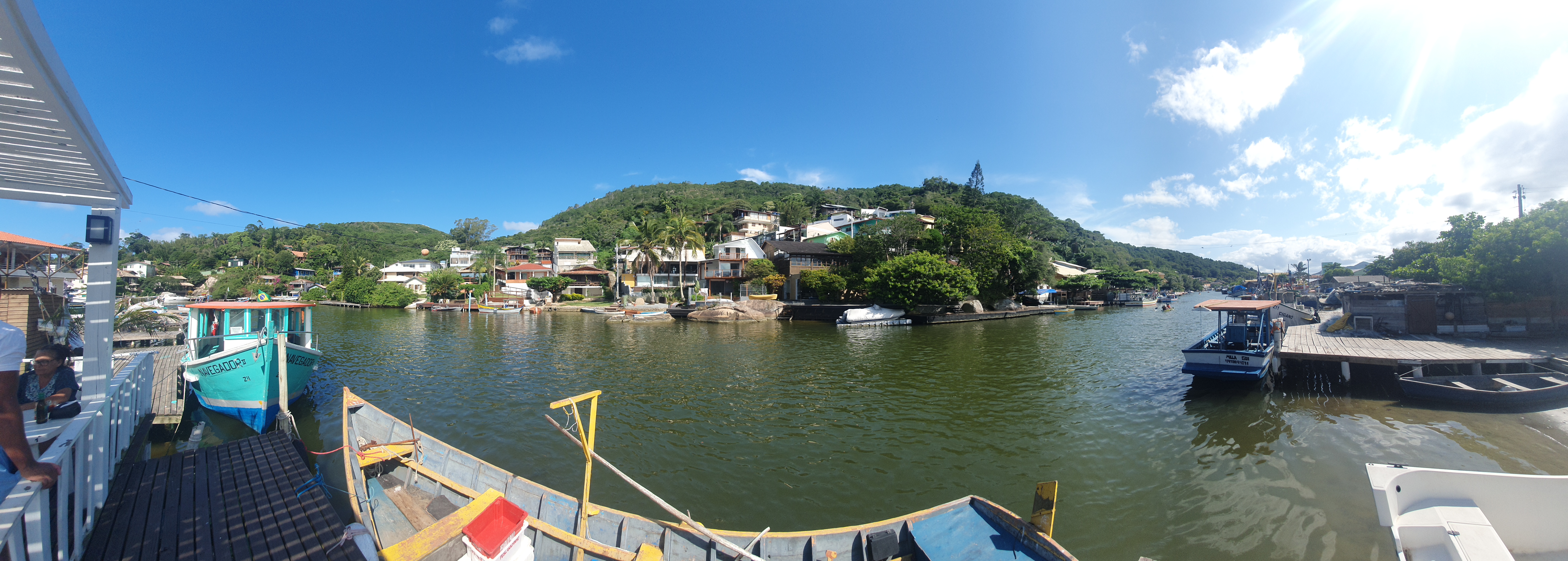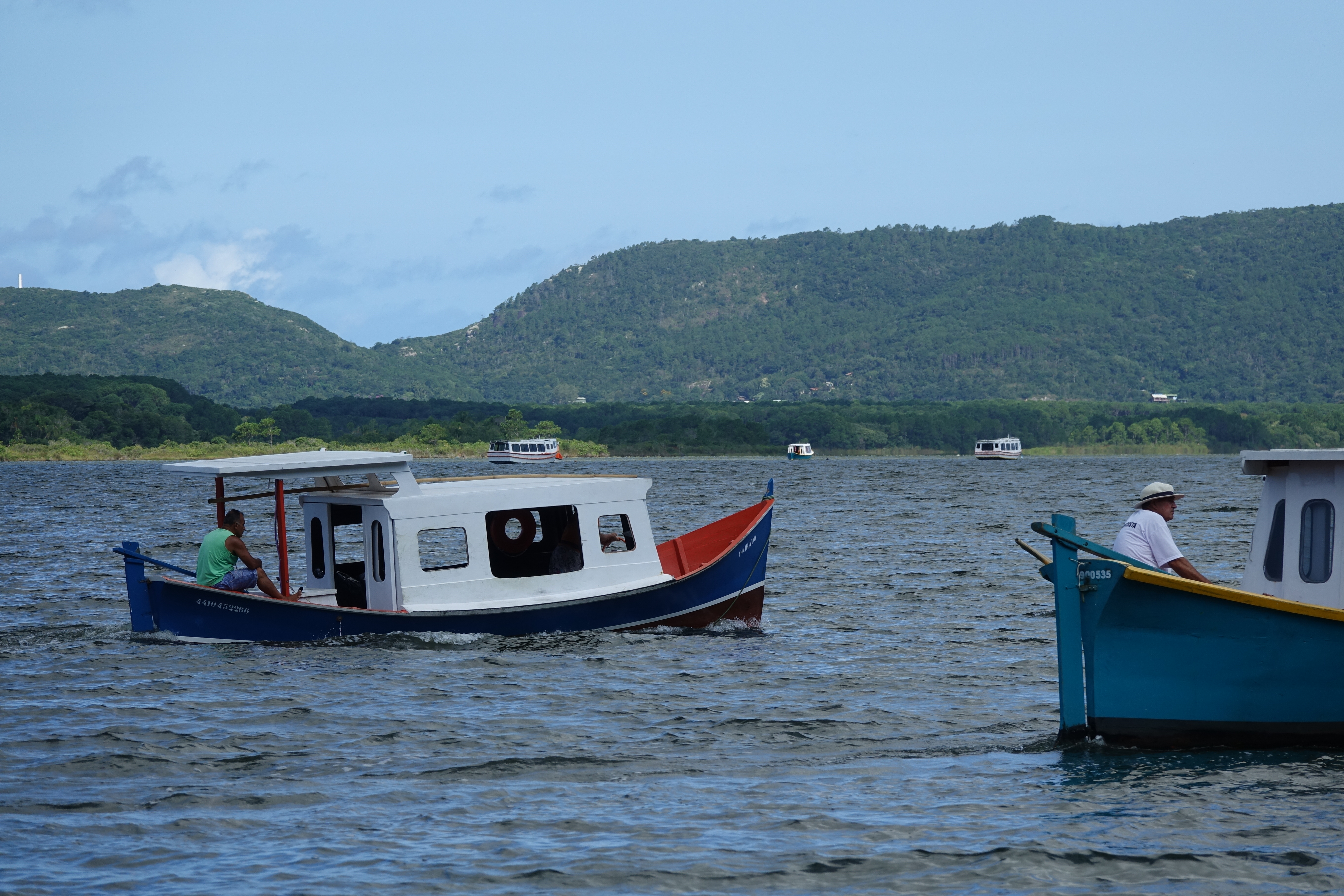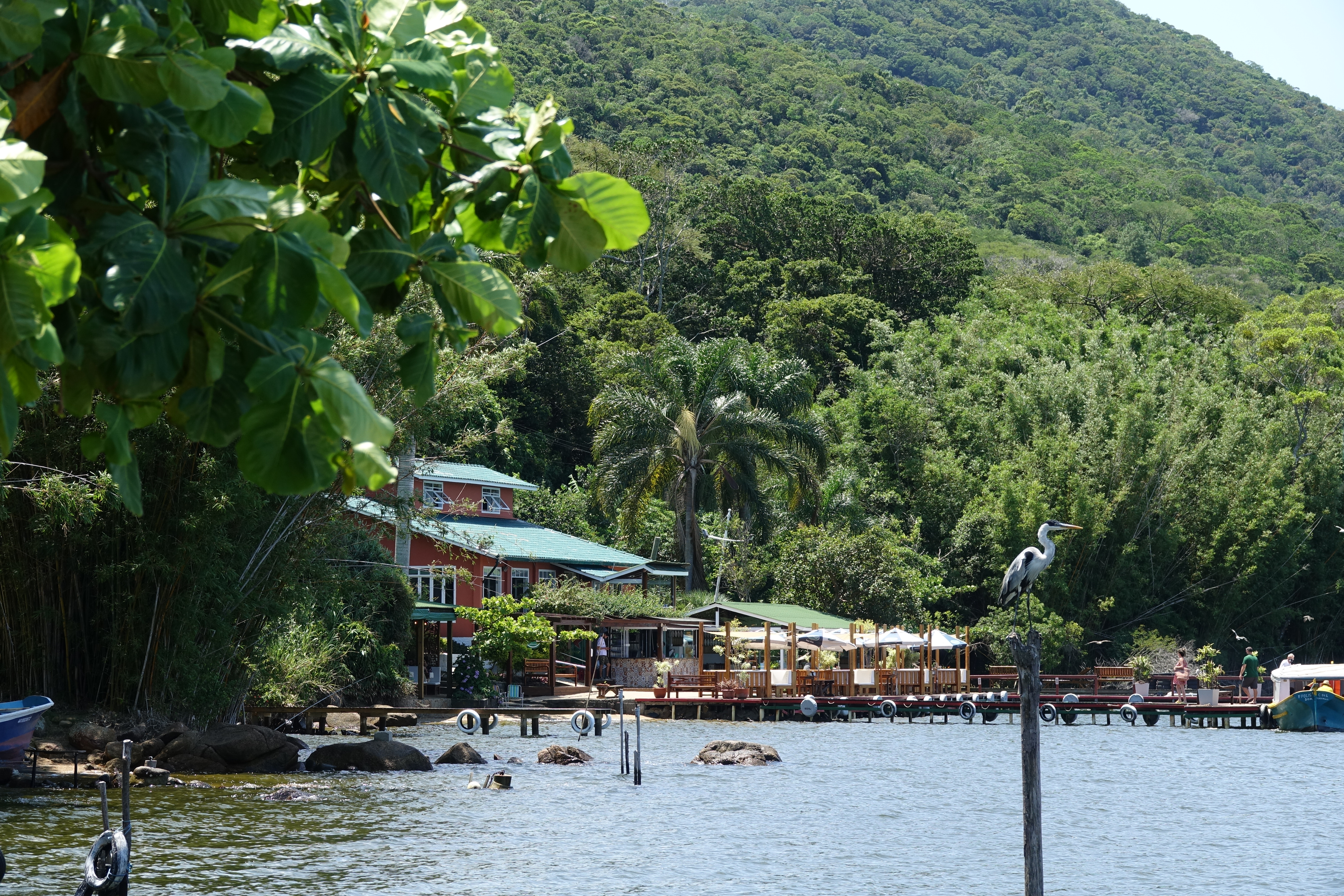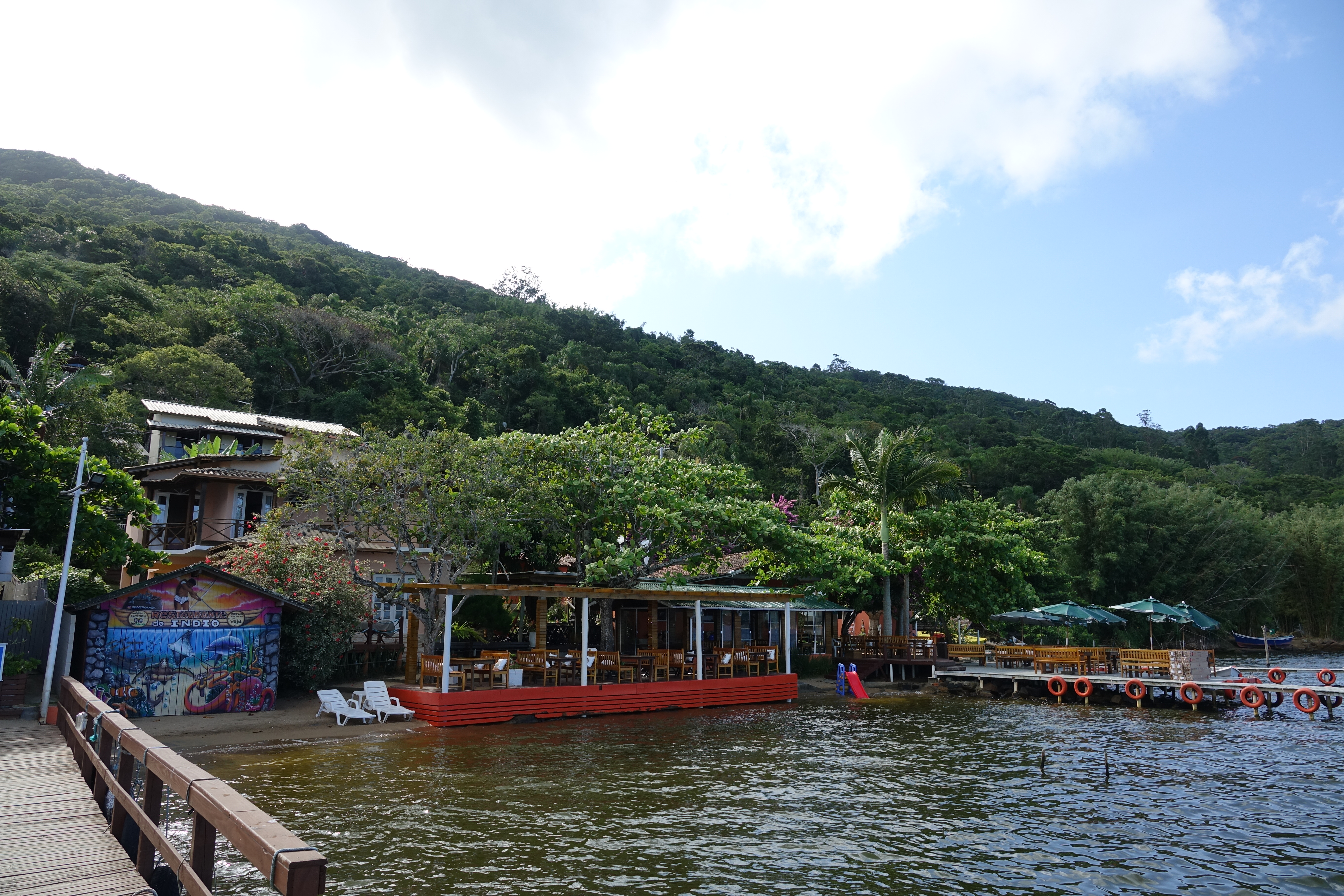 Barra do Lagoa, c’est aussi et surtout, notre coin préféré, à l’écart des plages et des hordes de touristes: l’embouchure du canal reliant les lacs à l’océan. Il suffit de quitter l’axe routier principal pour aussitôt se sentir isolés. Mieux, depuis notre petit appartement, un autre bateau-bus nous débarque directement sur le ponton de Maria & Maria, le meilleur restaurant du coin selon notre logeur, et on doit bien avouer qu’on a adoré! Pour la petite histoire, Maria a commencé par vendre du poisson frit dans son petit boui-boui, et les années passant, a réussi à le convertir en véritable restaurant… Une belle adresse donc, tant par la qualité de la cuisine qui y est présentée que par le cadre beau et reposant. Les maisons de l’autre coté de la rivière sont relativement isolées, les seules possibilités d’accès étant un passerelle piétonne ou la barque. Pas de véhicule donc, et la vision idyllique depuis notre table de ces belles maisons agrippées à la colline, dont on se demande comment elles y ont été construites. L’embouchure présenterai un autre intérêt, méconnu des touristes et donc préservé: on peut y plonger en apnée et y apercevoir des tortues au pied d’un énorme rocher, à environ 4m de fond (on sort de table et on plonge en face du ponton 😉 ). Il faut cependant que la marée soit montante pour que les eaux y soient limpides. Nous n’avons jamais pu arriver au bon moment et n’avons par conséquent pas pu profiter du spectacle promis.