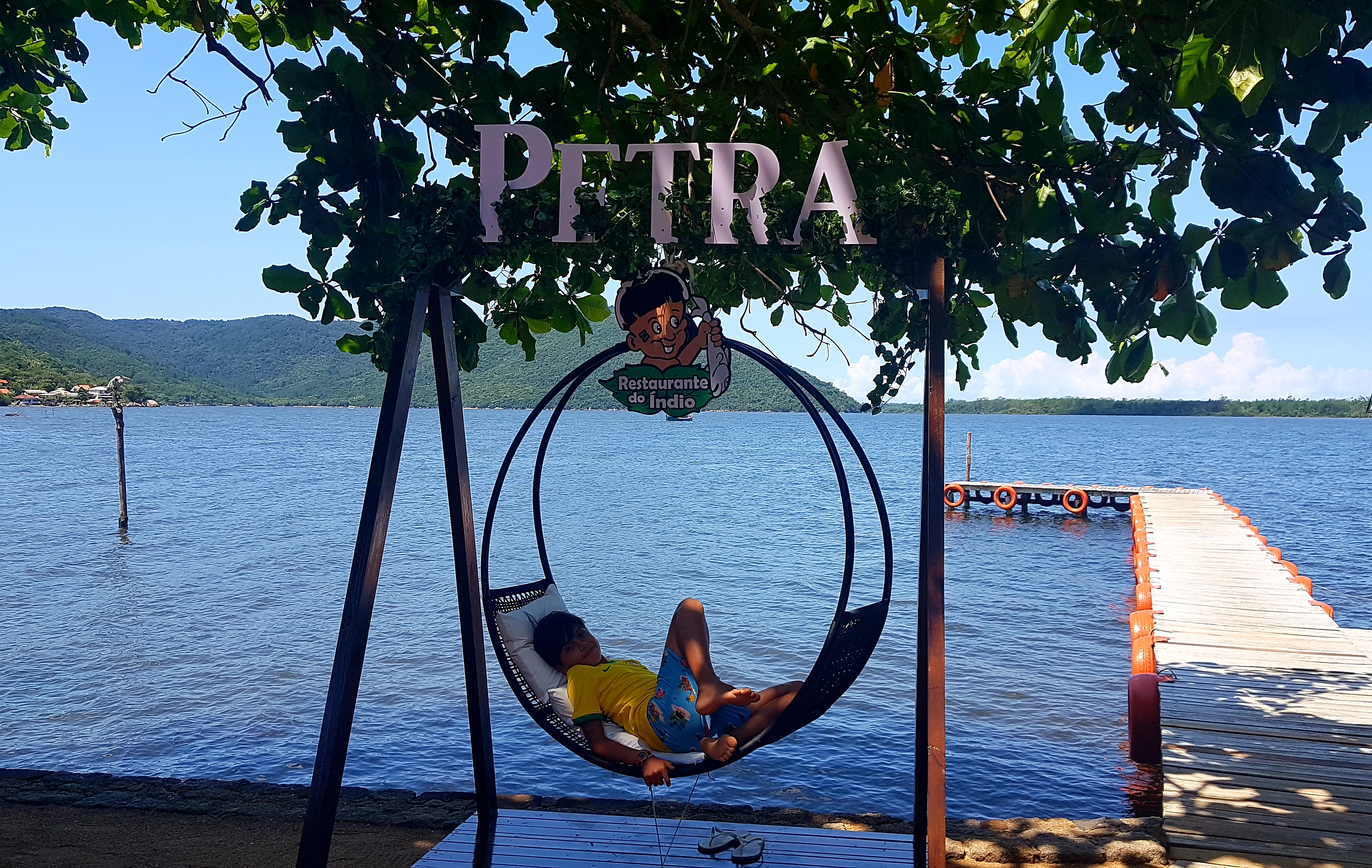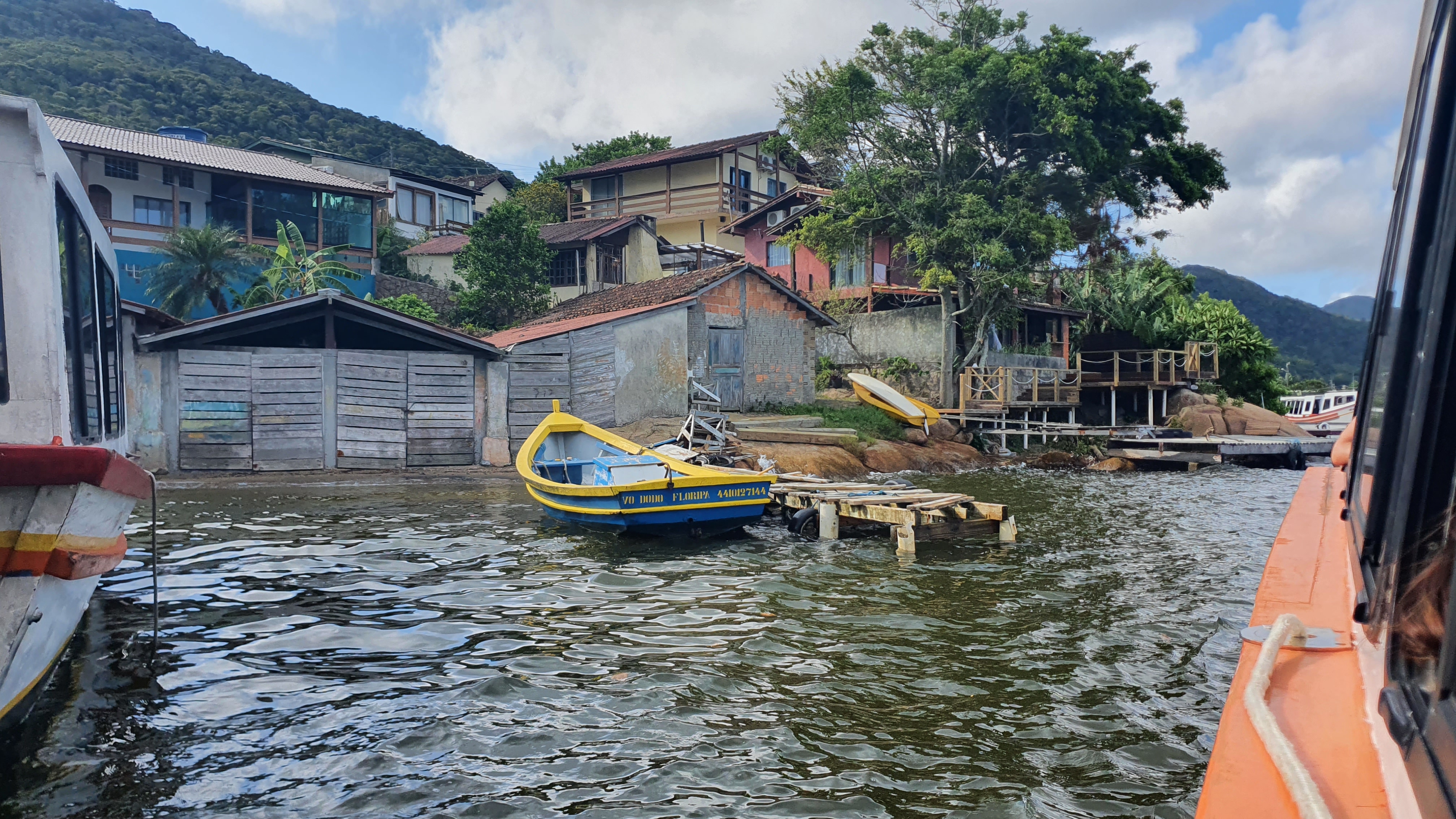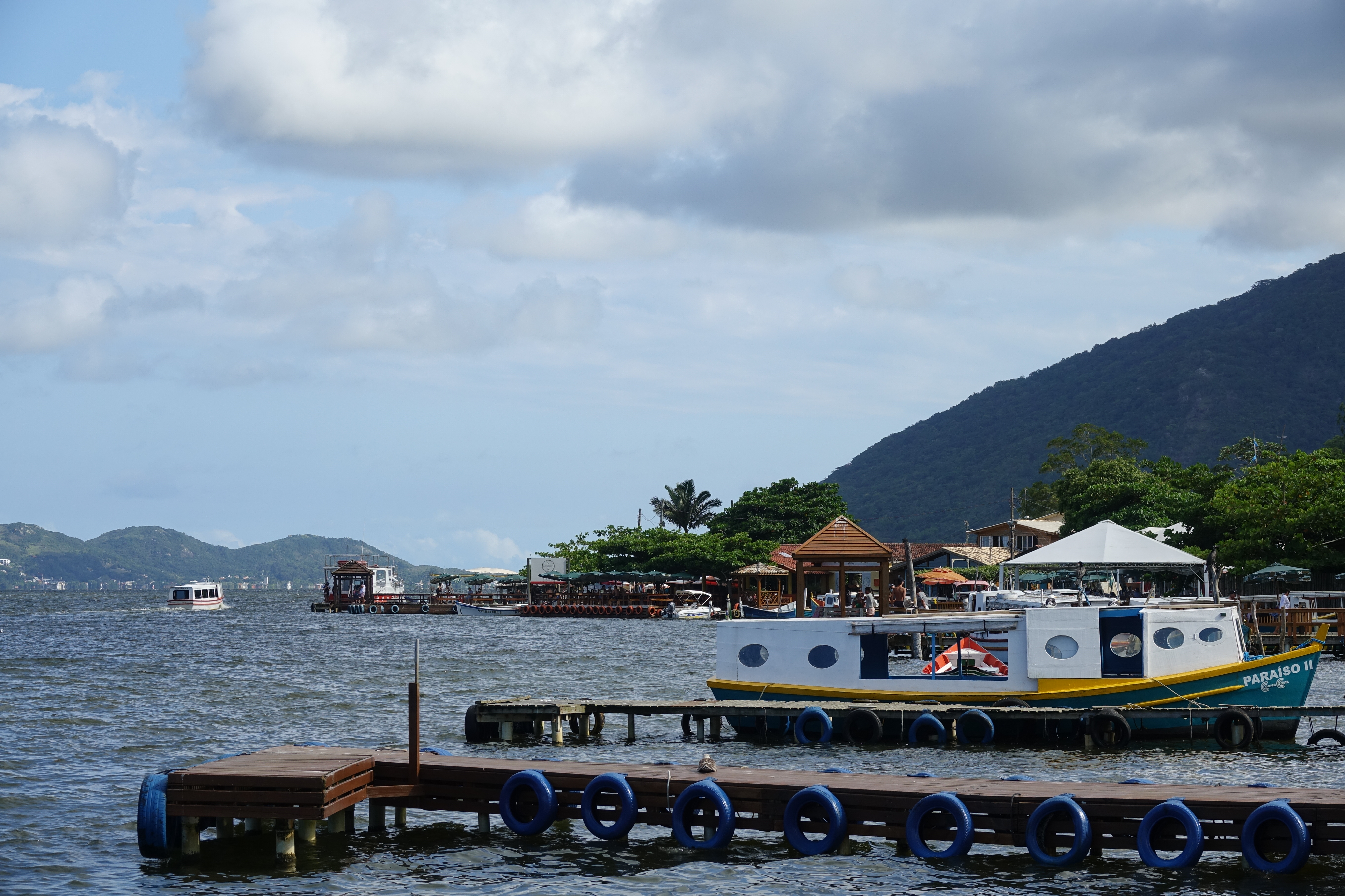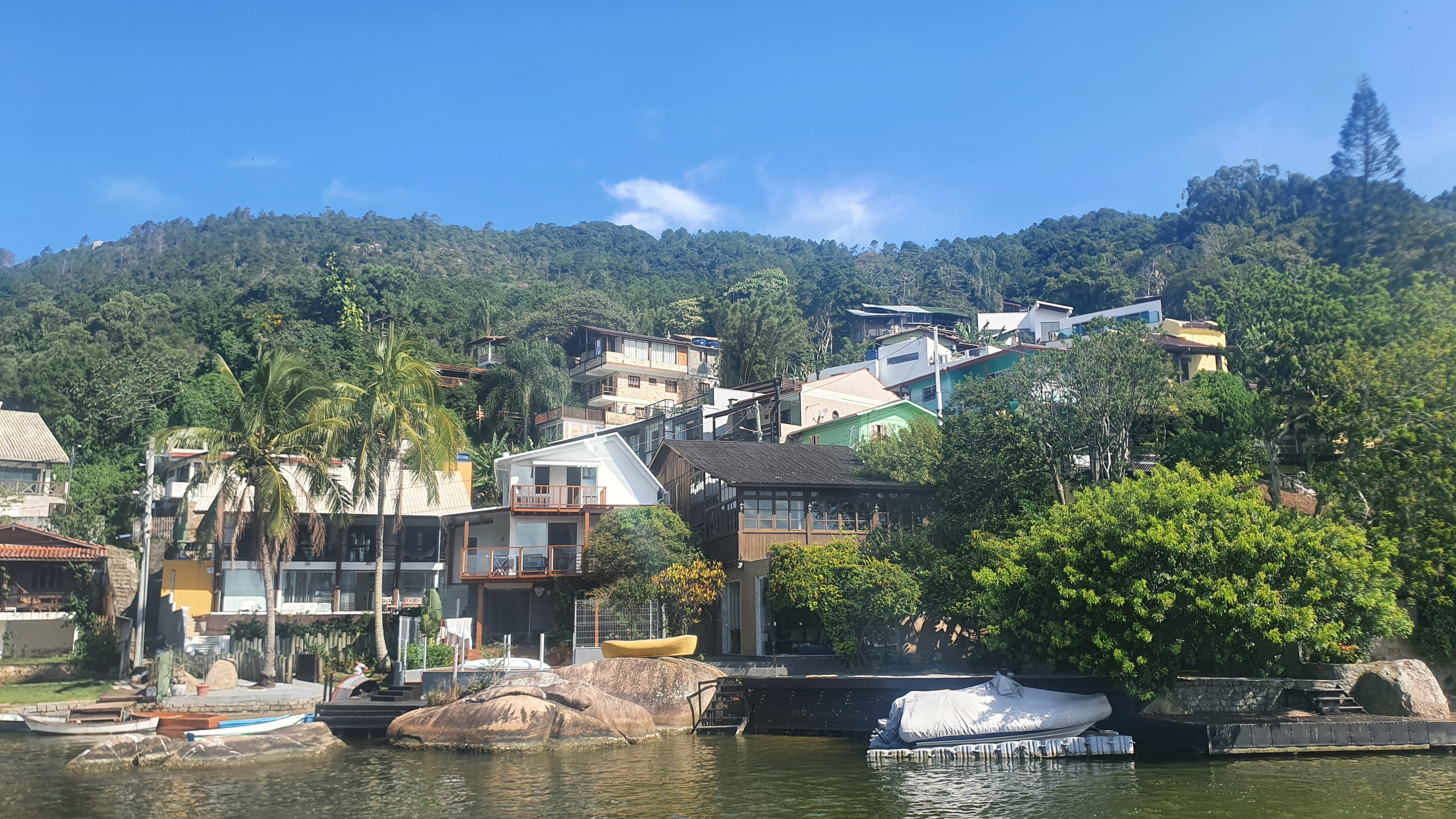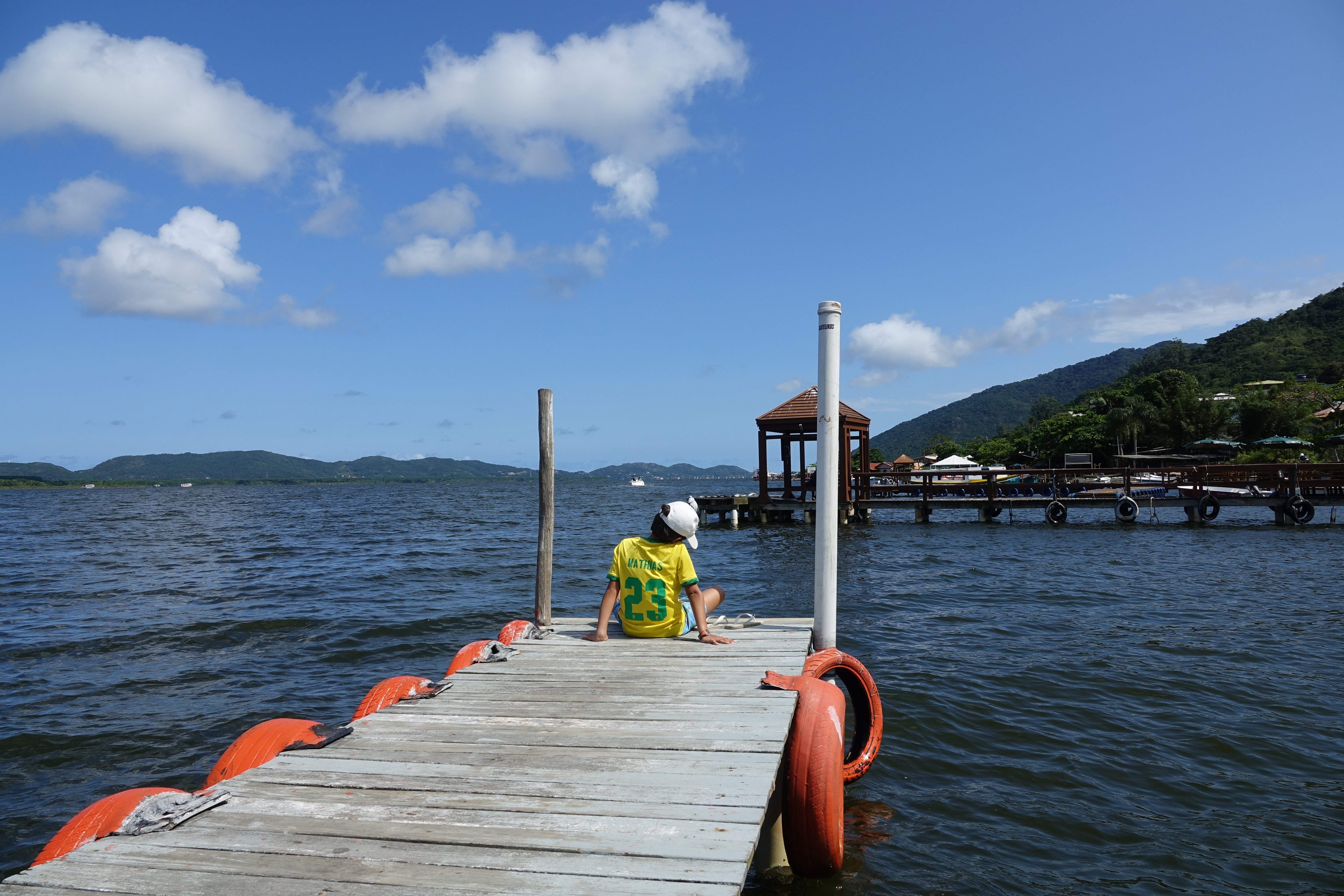 Barra do Lagoa, c’est aussi et surtout, notre coin préféré, à l’écart des plages et des hordes de touristes: l’embouchure du canal reliant les lacs à l’océan. Il suffit de quitter l’axe routier principal pour aussitôt se sentir isolés. Mieux, depuis notre petit appartement, un autre bateau-bus nous débarque directement sur le ponton de Maria & Maria, le meilleur restaurant du coin selon notre logeur, et on doit bien avouer qu’on a adoré! Pour la petite histoire, Maria a commencé par vendre du poisson frit dans son petit boui-boui, et les années passant, a réussi à le convertir en véritable restaurant… Une belle adresse donc, tant par la qualité de la cuisine qui y est présentée que par le cadre beau et reposant. Les maisons de l’autre coté de la rivière sont relativement isolées, les seules possibilités d’accès étant un passerelle piétonne ou la barque. Pas de véhicule donc, et la vision idyllique depuis notre table de ces belles maisons agrippées à la colline, dont on se demande comment elles y ont été construites. L’embouchure présenterai un autre intérêt, méconnu des touristes et donc préservé: on peut y plonger en apnée et y apercevoir des tortues au pied d’un énorme rocher, à environ 4m de fond (on sort de table et on plonge en face du ponton 😉 ). Il faut cependant que la marée soit montante pour que les eaux y soient limpides. Nous n’avons jamais pu arriver au bon moment et n’avons par conséquent pas pu profiter du spectacle promis.